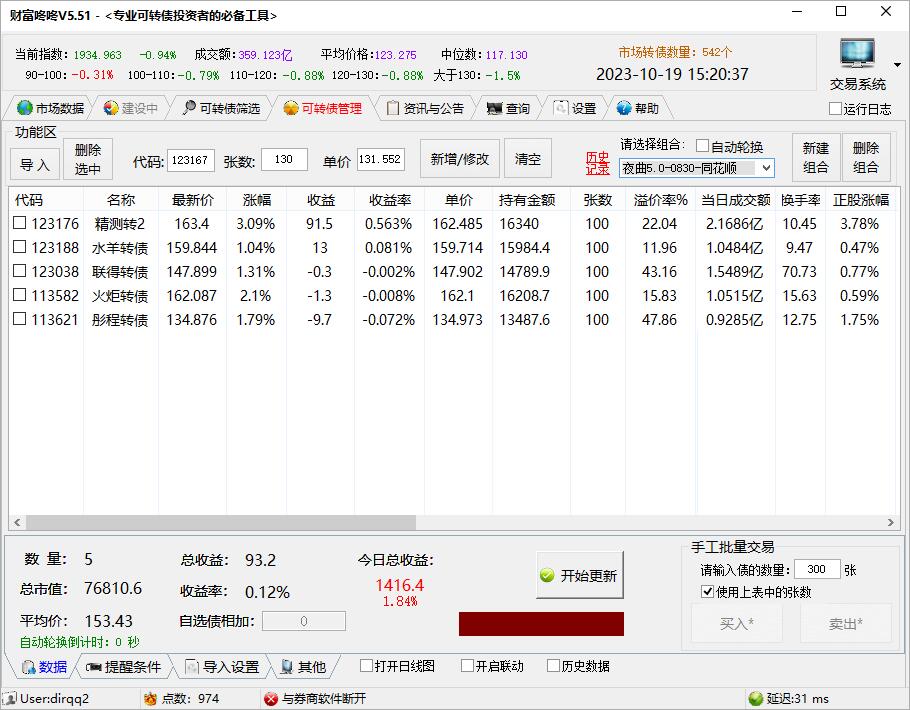 大家好,我是咚哥,财富咚咚设计之初是辅助我建立自己的交易系统用的,经过这几年的完善,现在已经非常成熟。想更好的使用财富咚咚,那么就需要对我的交易思维有一些了解。普通散户他们去炒股或者去炒债,不论持有多少支,都是分开来操作单支股票或转债的。而我的方法是建立一个小组合(4-6支),只看整体收益率,根据市场行情,批量建仓或者全部清仓。不看个股个债,更不去追高,知道了这一点就能理解软件中的股票管理和可转债管理的作用了,主要就是看这个组合整体的收益情况。